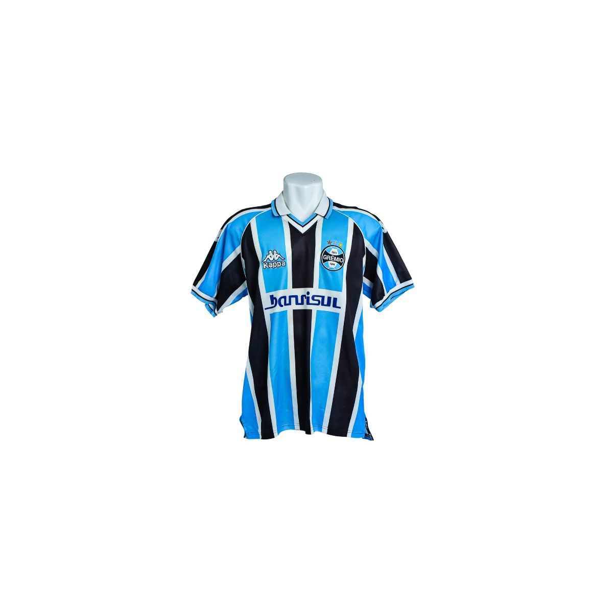 A camisa listrada do Grêmio, fabricada pela Kappa, é um modelo clássico do início dos anos 2000, período marcado por forte identidade visual e pela consolidação da parceria com o patrocínio Banrisul. A peça mantém o equilíbrio entre tradição e design esportivo característico da marca italiana, sendo amplamente utilizada em jogos oficiais da época.
