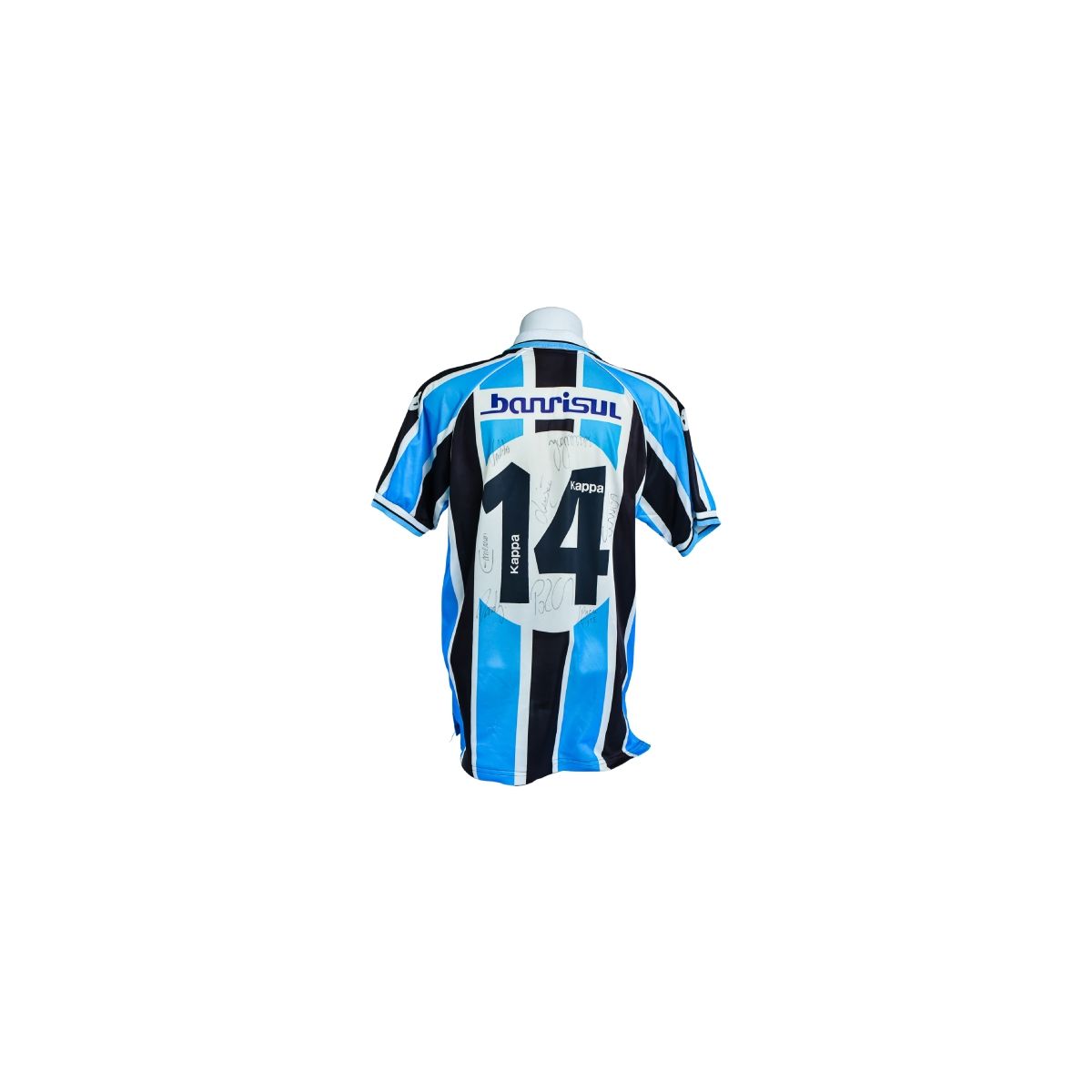 Camisas do Grêmio produzidas pela Kappa no início dos anos 2000 são bastante valorizadas por colecionadores, especialmente quando apresentam personalização e assinaturas originais. Modelos autografados, como este, transformam-se em peças únicas, representando não apenas um uniforme de jogo, mas também um registro histórico da trajetória do clube.