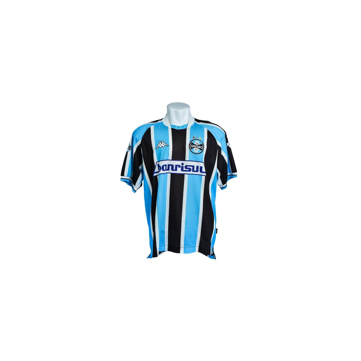 A camisa listrada do Grêmio, fabricada pela Kappa, é um modelo clássico do início dos anos 2000, período marcado pela forte identidade visual do clube e pela presença consolidada da marca italiana nos uniformes do Tricolor Gaúcho. A peça combina tradição, design europeu e robustez, características marcantes dessa fase.