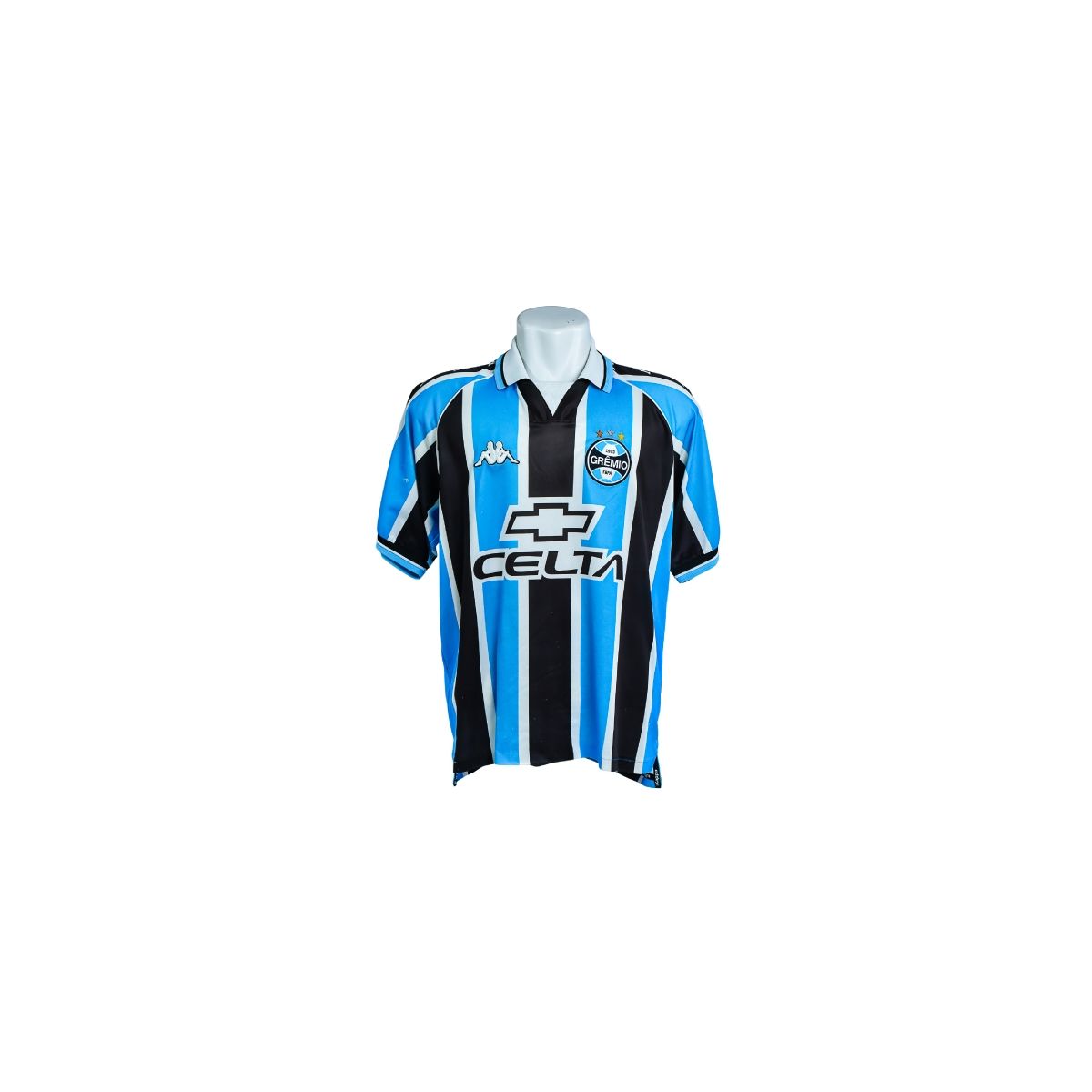 No peito, destacam-se o escudo do Grêmio com estrelas, o logotipo da Kappa e o patrocínio Chevrolet Celta, aplicados de forma centralizada e harmoniosa, compondo um visual fiel aos uniformes oficiais da época.