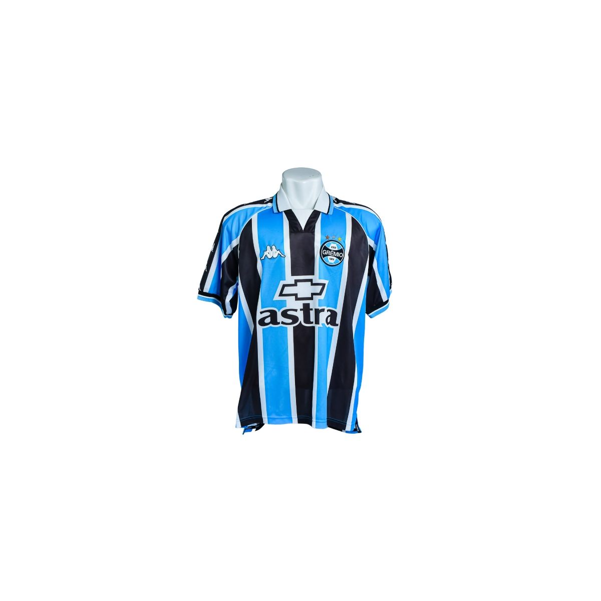No peito, destacam-se o escudo do Grêmio com estrelas, o logotipo da Kappa aplicado em relevo e o patrocínio Astra centralizado, compondo um visual marcante e fiel aos uniformes oficiais utilizados em campo naquele período.