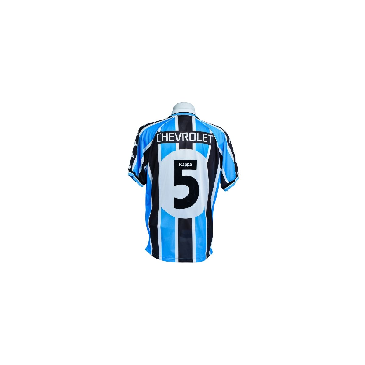 Na parte traseira, a camisa traz o patrocínio Chevrolet na região superior e o número 5, aplicado em numeração preta sobre fundo branco, seguindo o padrão clássico adotado pelo clube na época. O conjunto reforça a estética robusta e tradicional do uniforme.
