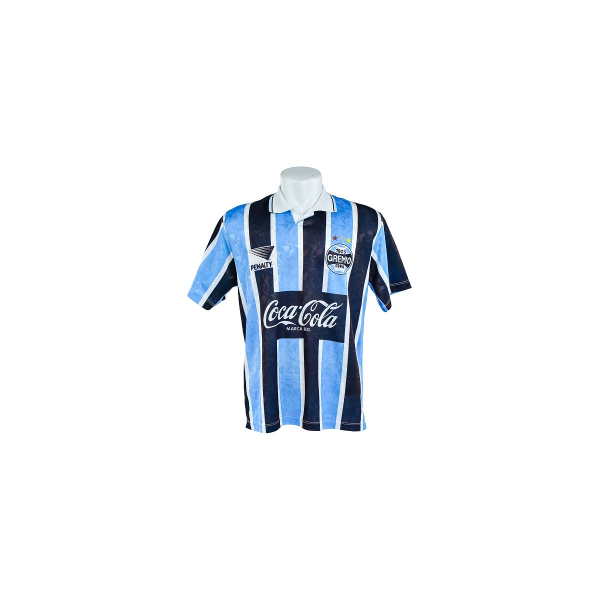 A camisa listrada do Grêmio, fabricada pela Penalty, representa a transição dos anos 1980 para os anos 1990, período em que os uniformes passaram a incorporar tecidos sintéticos e grafismos mais elaborados. Mantendo as tradicionais listras verticais em azul, preto e branco, o modelo preserva a identidade clássica do Tricolor Gaúcho com uma leitura mais moderna para a época.