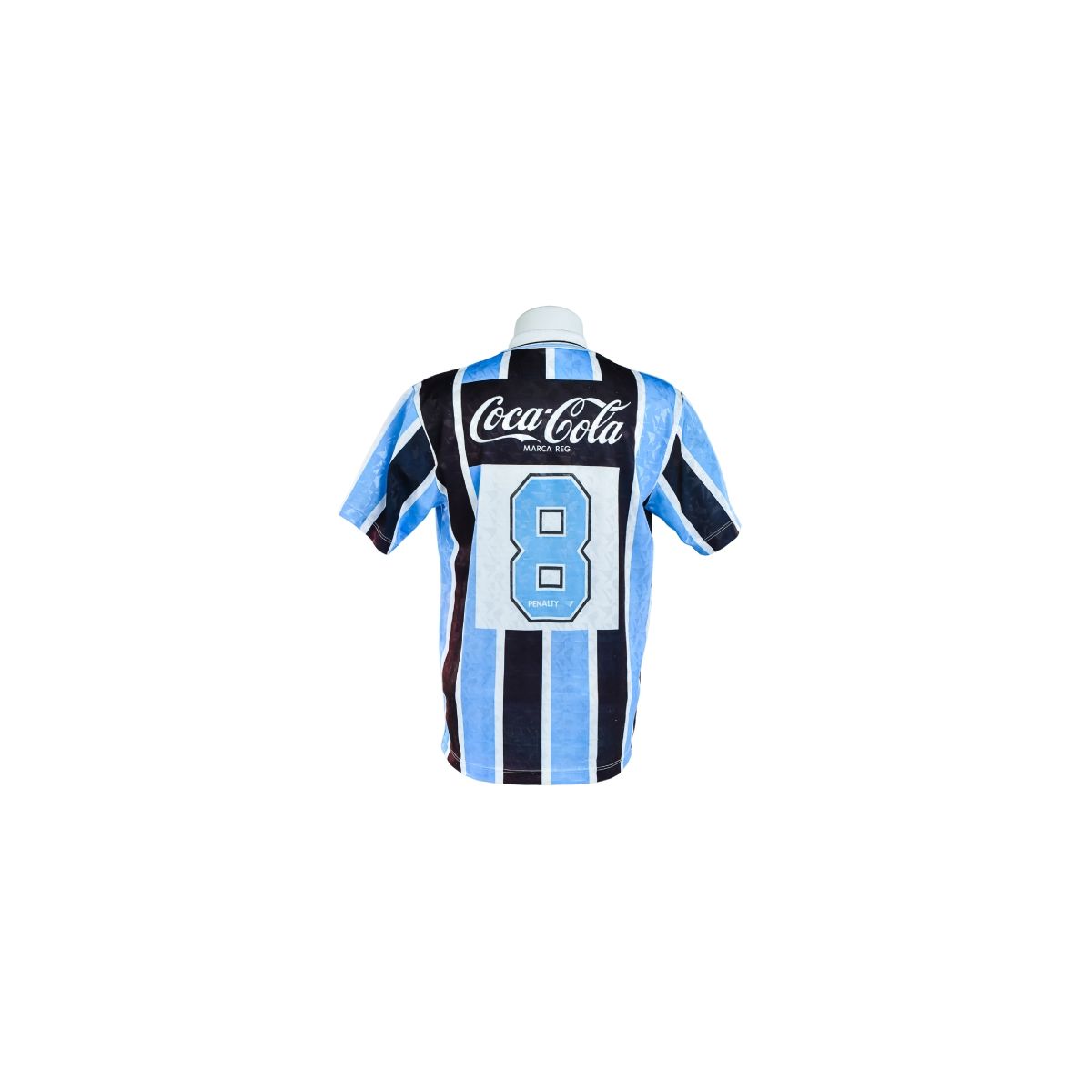 Nas costas, a camisa traz novamente o patrocínio Coca-Cola na parte superior e o número #8 em estampa azul-clara com contorno branco, em fonte Penalty típica do período. Trata-se de uma peça que simboliza a evolução estética dos uniformes gremistas sem abandonar a tradição.