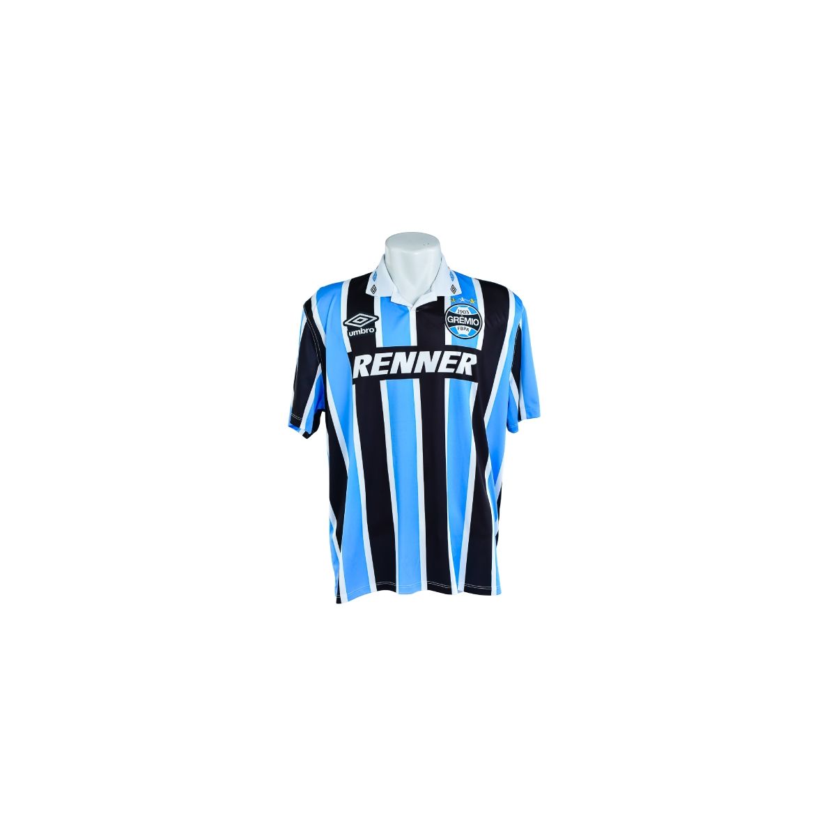 A camisa listrada do Grêmio, fabricada pela Umbro, representa um período de transição visual do clube no final da década de 1990, quando os uniformes passaram a adotar cortes mais modernos sem abandonar a tradição. O modelo mantém as clássicas listras verticais em azul, preto e branco, preservando a identidade histórica do Tricolor Gaúcho.