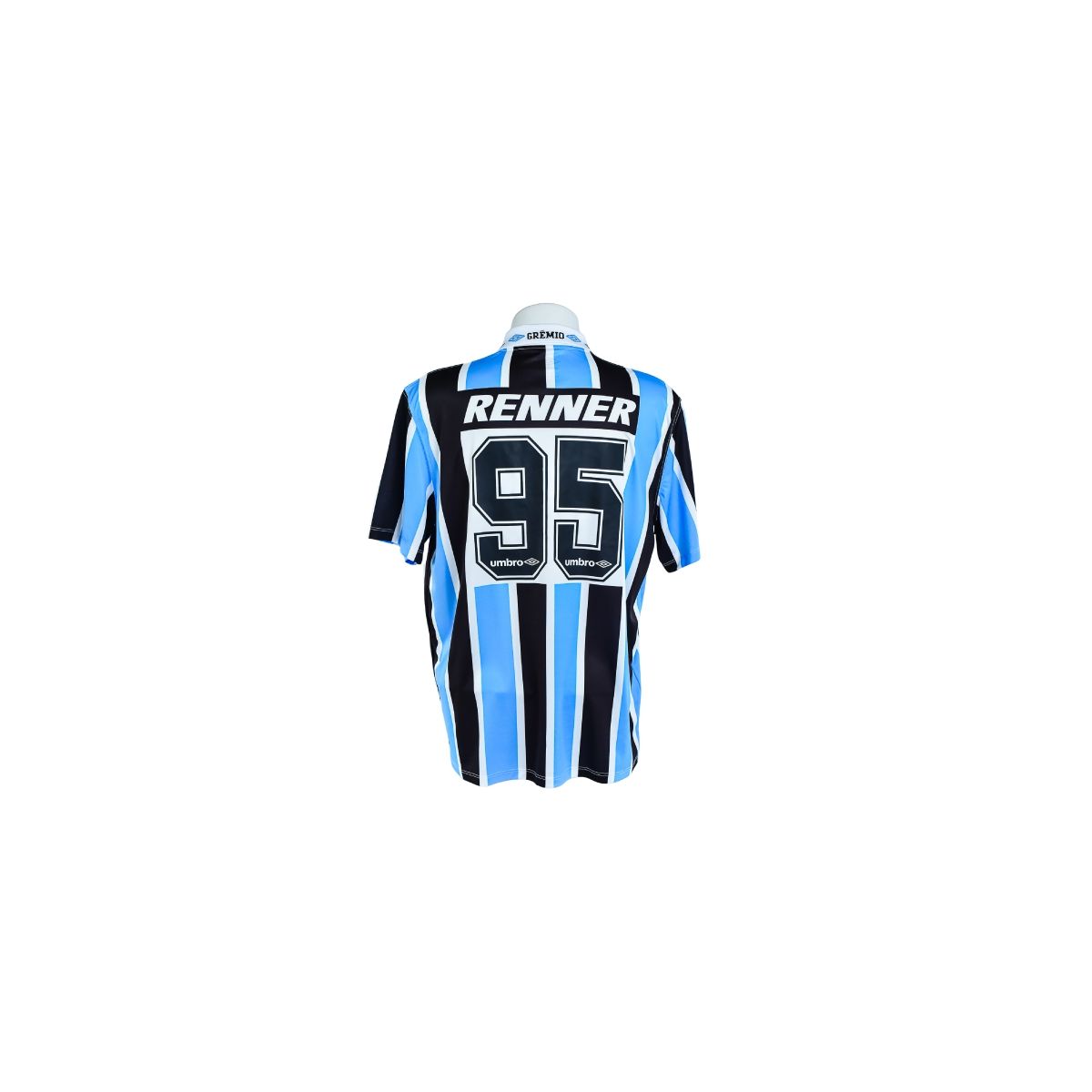 O uniforme apresenta gola polo branca com detalhe interno personalizado, mangas curtas e tecido esportivo leve, característico da Umbro na época. No peito, o destaque fica por conta do patrocínio Renner, aplicado em faixa horizontal, acompanhado do escudo do Grêmio FBPA com estrelas e do logotipo Umbro, compondo um visual equilibrado e marcante.