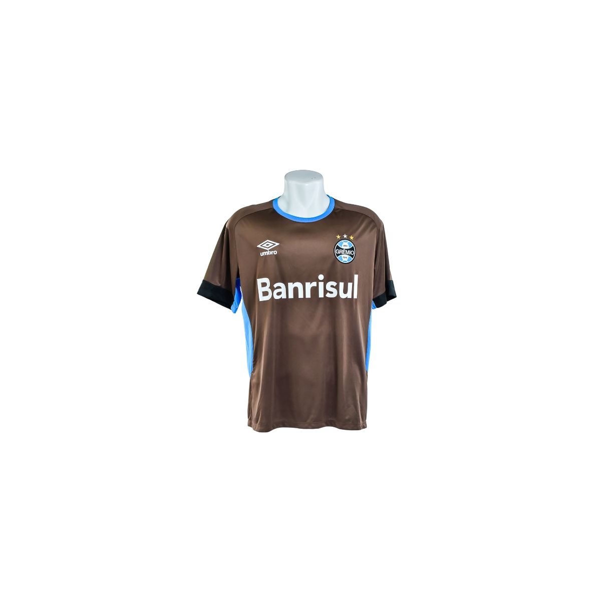 A camisa marrom do Grêmio, fabricada pela Umbro, é um modelo alternativo que foge completamente do padrão tradicional do clube, destacando-se pela proposta visual ousada e pouco convencional. Com o marrom predominante combinado a detalhes em azul nas laterais e na gola, o uniforme apresenta uma leitura moderna e diferenciada da identidade tricolor.
