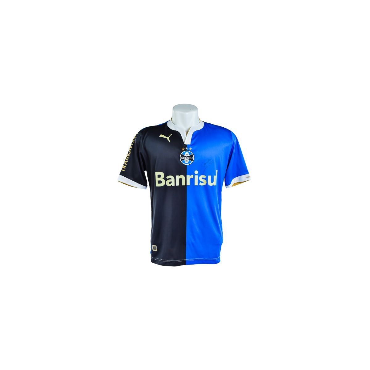 A camisa meio a meio do Grêmio, fabricada pela Puma, é um dos modelos mais ousados e marcantes da história recente do clube. Com design dividido verticalmente entre preto e azul, o uniforme simboliza a união das cores tradicionais do Tricolor Gaúcho em uma proposta moderna e impactante.