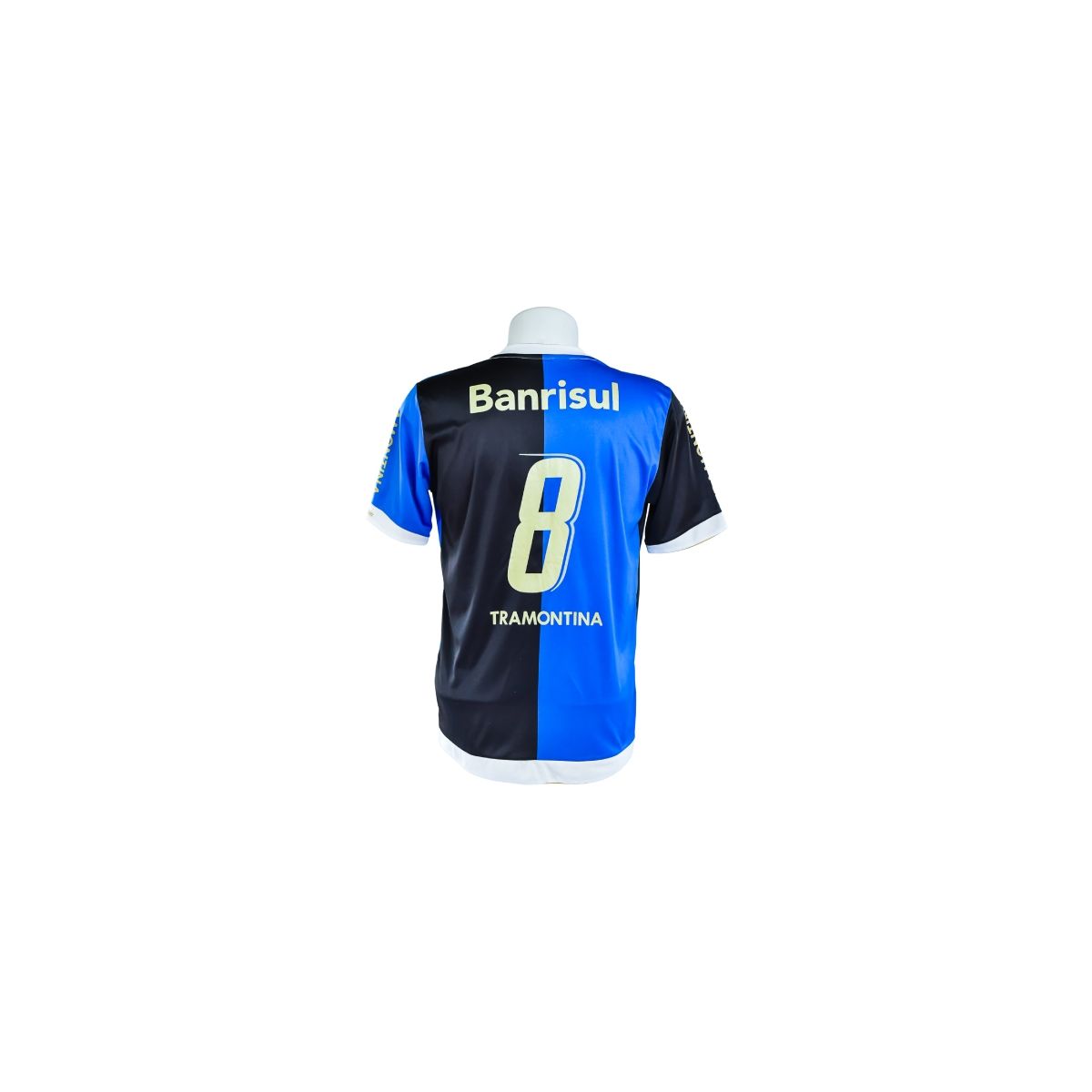 Nas costas, a camisa exibe o número #8 em estampa dourada, com o patrocínio Banrisul posicionado acima e a marca Tramontina abaixo do número. O contraste entre as cores e os detalhes em dourado confere à camisa um aspecto premium e altamente reconhecível.