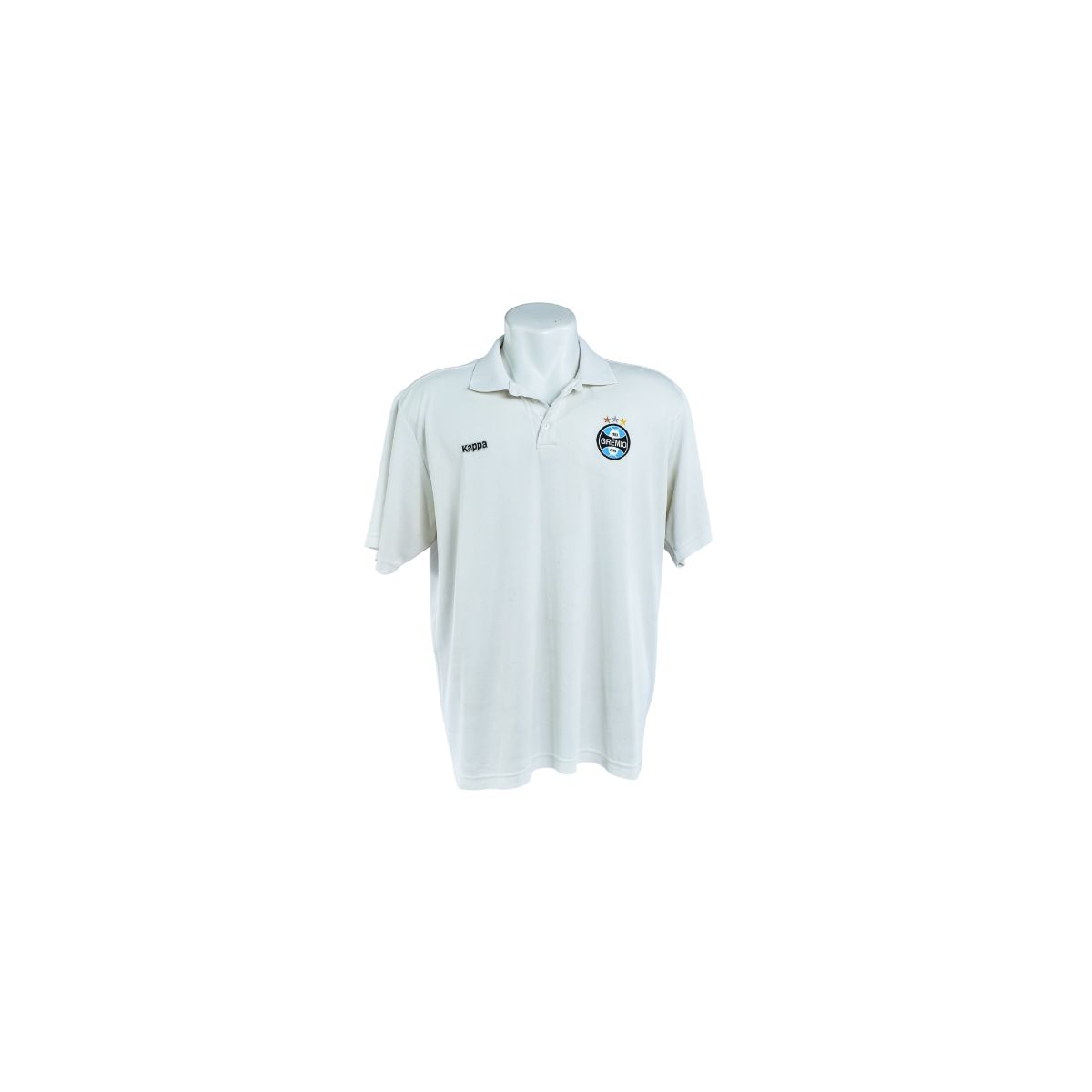 O design traz o branco predominante, com gola polo clássica e fechamento em botões. No peito, o escudo do Grêmio com estrelas aparece aplicado no lado esquerdo, enquanto o discreto logotipo Kappa surge no lado oposto, mantendo equilíbrio visual e identidade oficial. As mangas curtas e o corte reto reforçam o conforto e o caimento tradicional da peça.