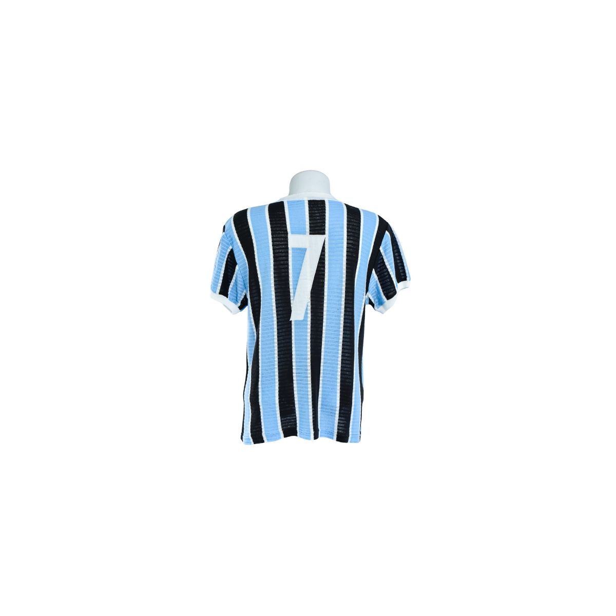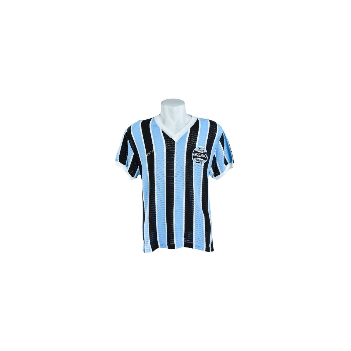 O uniforme apresenta as tradicionais listras verticais em azul-claro, preto e branco, com tecido de malha mais encorpado e textura visível, característica típica das camisas antigas. A gola em “V” branca reforça o estilo retrô, enquanto o escudo do Grêmio no formato antigo, aplicado no peito, conecta a camisa diretamente à história institucional do clube. Próximo ao escudo, destaca-se a inscrição “1973”, referência a um ano marcante da era setentista gremista.