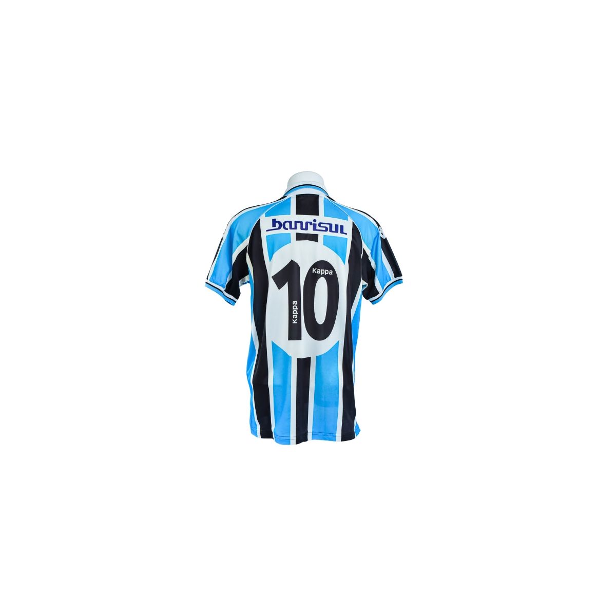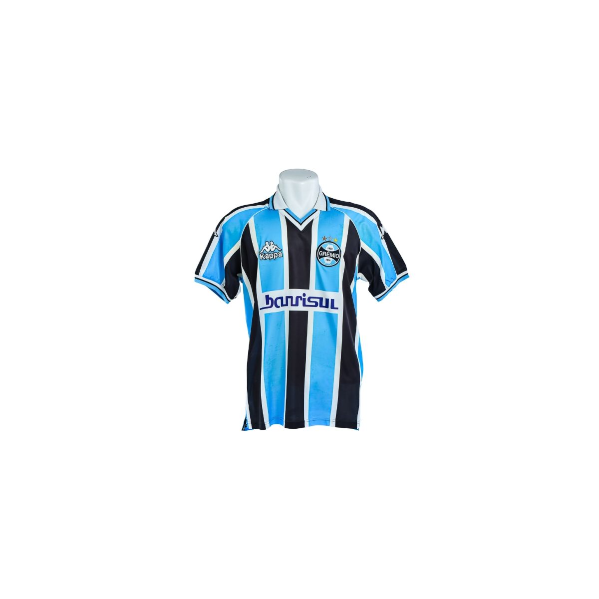O uniforme apresenta as tradicionais listras verticais em azul claro, preto e branco, padrão que se tornou um dos maiores símbolos do Grêmio ao longo das décadas. A gola em V branca reforça o visual clássico da camisa, muito comum nos modelos da época, assim como o tecido com textura mais encorpada, típico dos uniformes antigos.