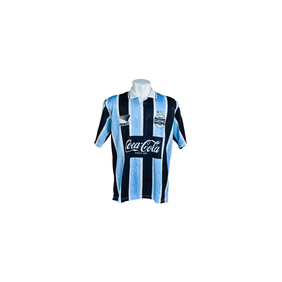 No peito, destacam-se o escudo do Grêmio com estrelas, o logotipo Penalty e o patrocínio Coca-Cola em destaque, compondo um conjunto visual equilibrado e imediatamente reconhecível entre os uniformes históricos do clube.