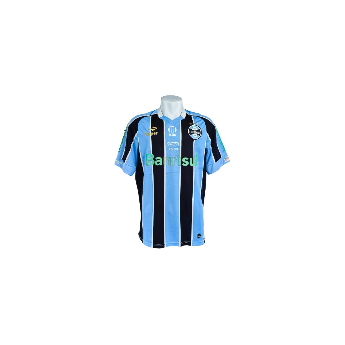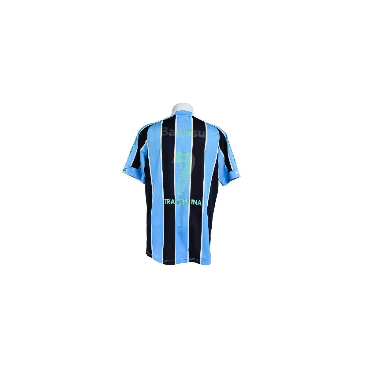 Os uniformes do Grêmio produzidos pela Topper nesse período ficaram marcados pela forte presença de patrocinadores em cores alternativas, como o verde do Banrisul, criando um contraste visual único. Camisas com numeração translúcida, como esta de número 7, são menos comuns e despertam interesse especial entre colecionadores por representarem uma identidade visual específica de uma fase do clube.